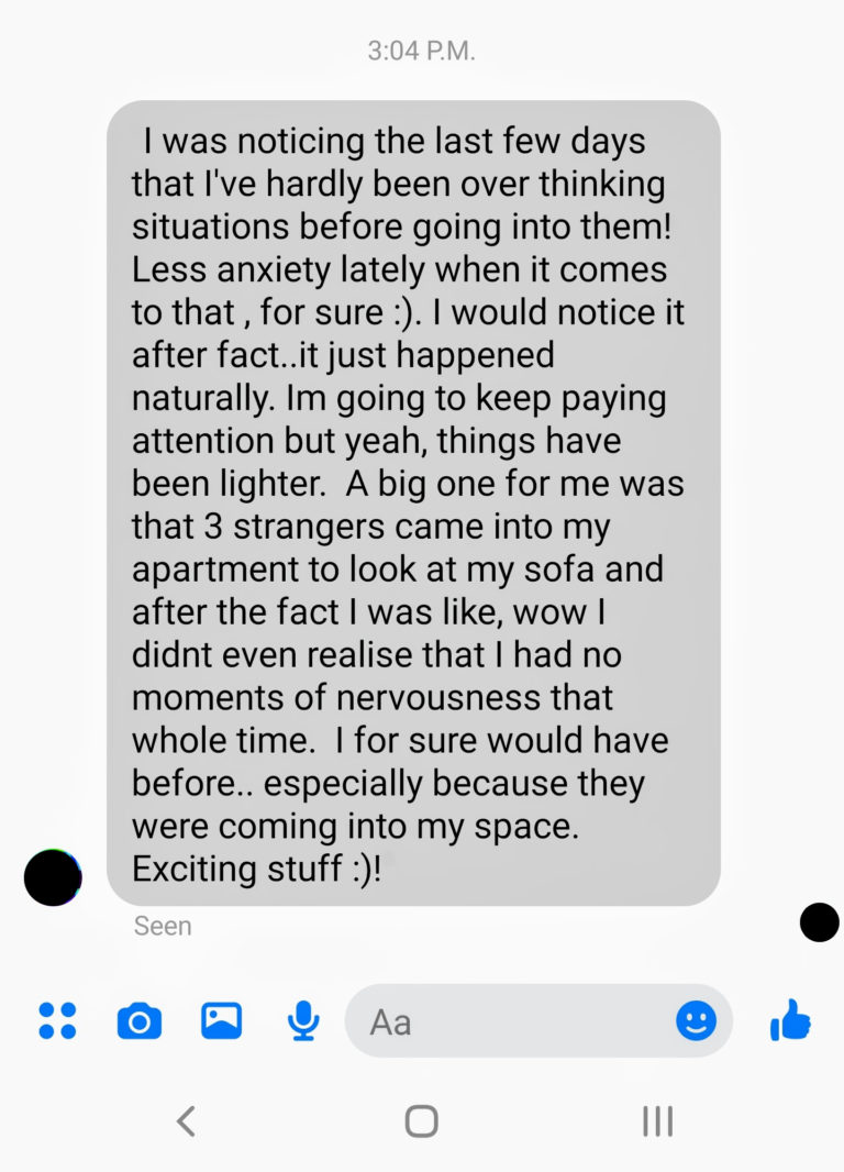The biggest change in my overall feeling is on a physical level. The discomfort I often feel in my gut is completely gone. I would say, my anxiety has shifted from a 10 to a 1 or 2…”