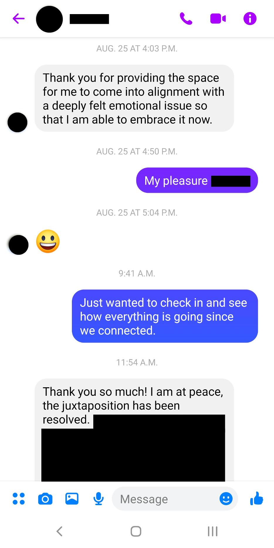 Thank you sooo sooo much for yesterday, I feel amazing, after I left your office I went to the hospital to visit my friend and we were talking about what have happen with my ex, and I was feeling nothing, I did not cry, I did not feel bad at all and usually, I was always choking or crying when I was talking of it.