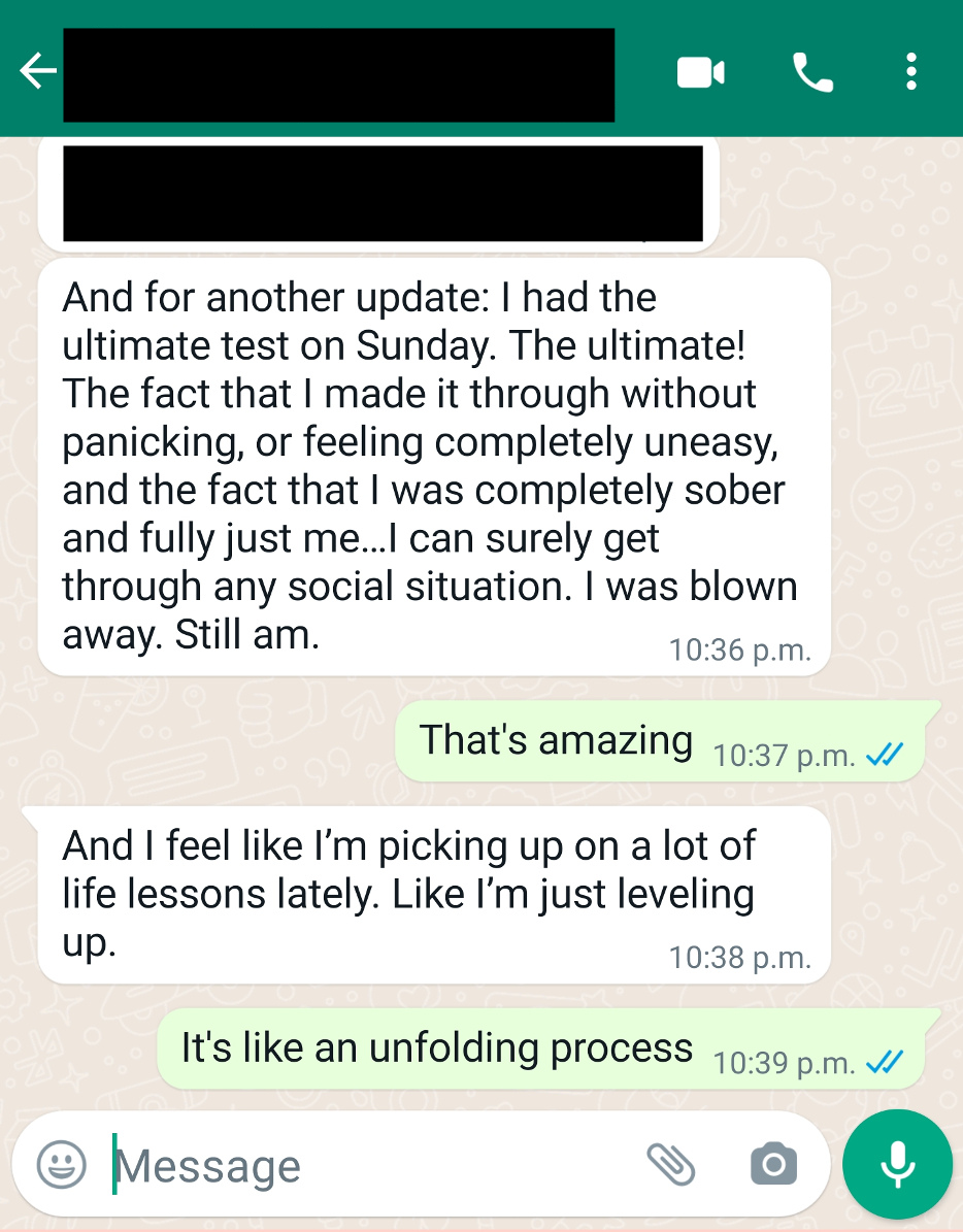 “Things have improved in a very unexpected way. I didn’t consciously notice a difference until Thursday afternoon while speaking to my sister. I caught myself saying that I believe I can go to work and now I’m trying to decide what path to take. which is actually quite mind blowing for me.