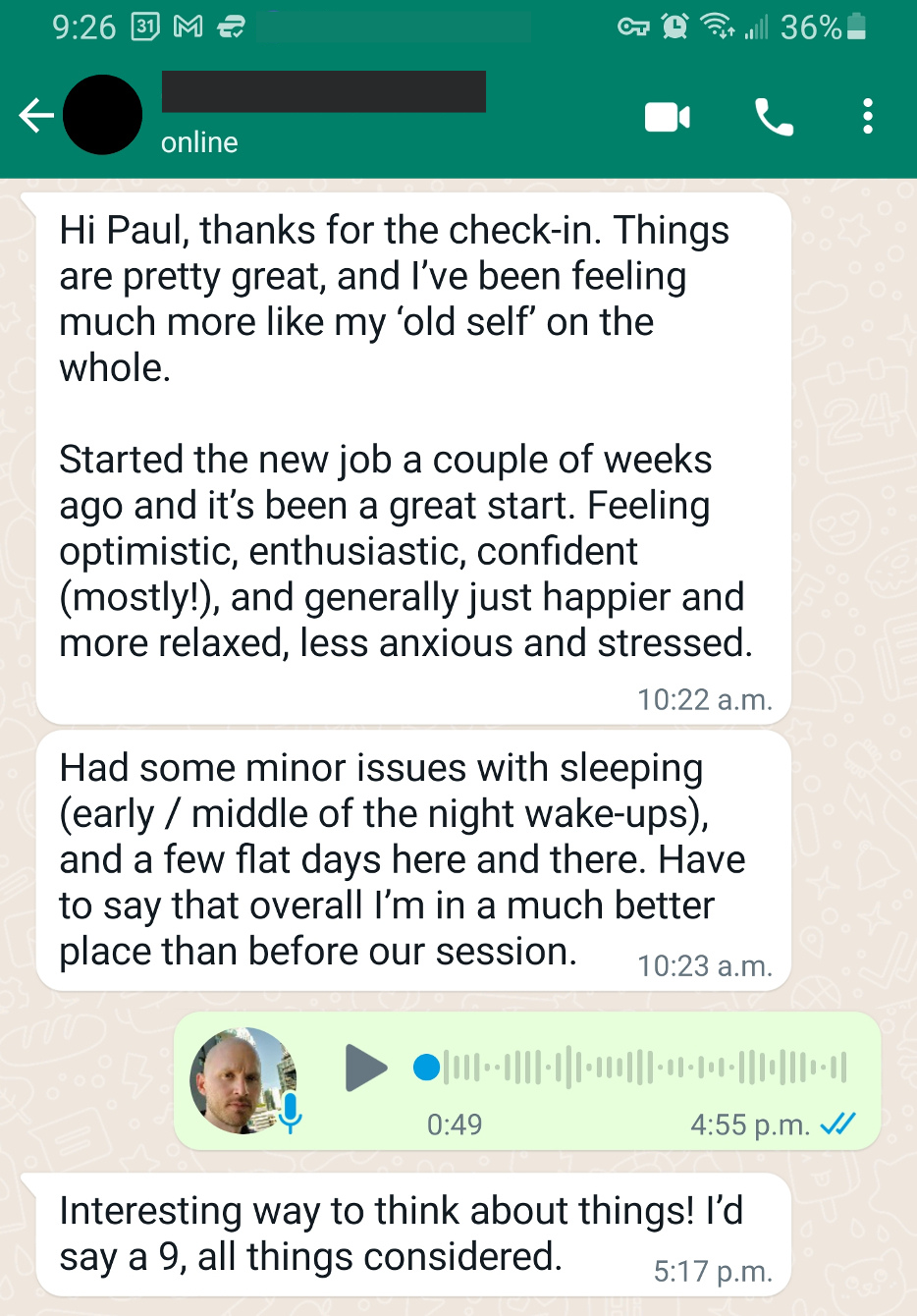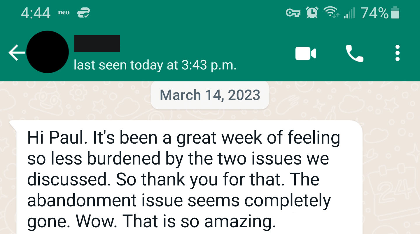 My advice to anyone considering working with Paul would be that life is too short to put off fixing issues that hold them back from enjoying their lives. After trying other therapies, this is the only one that helped me. While Paul’s approach can be seen as a non-conventional method, it is worth a try. I trusted Paul completely with this process and I’m very glad that I did.
