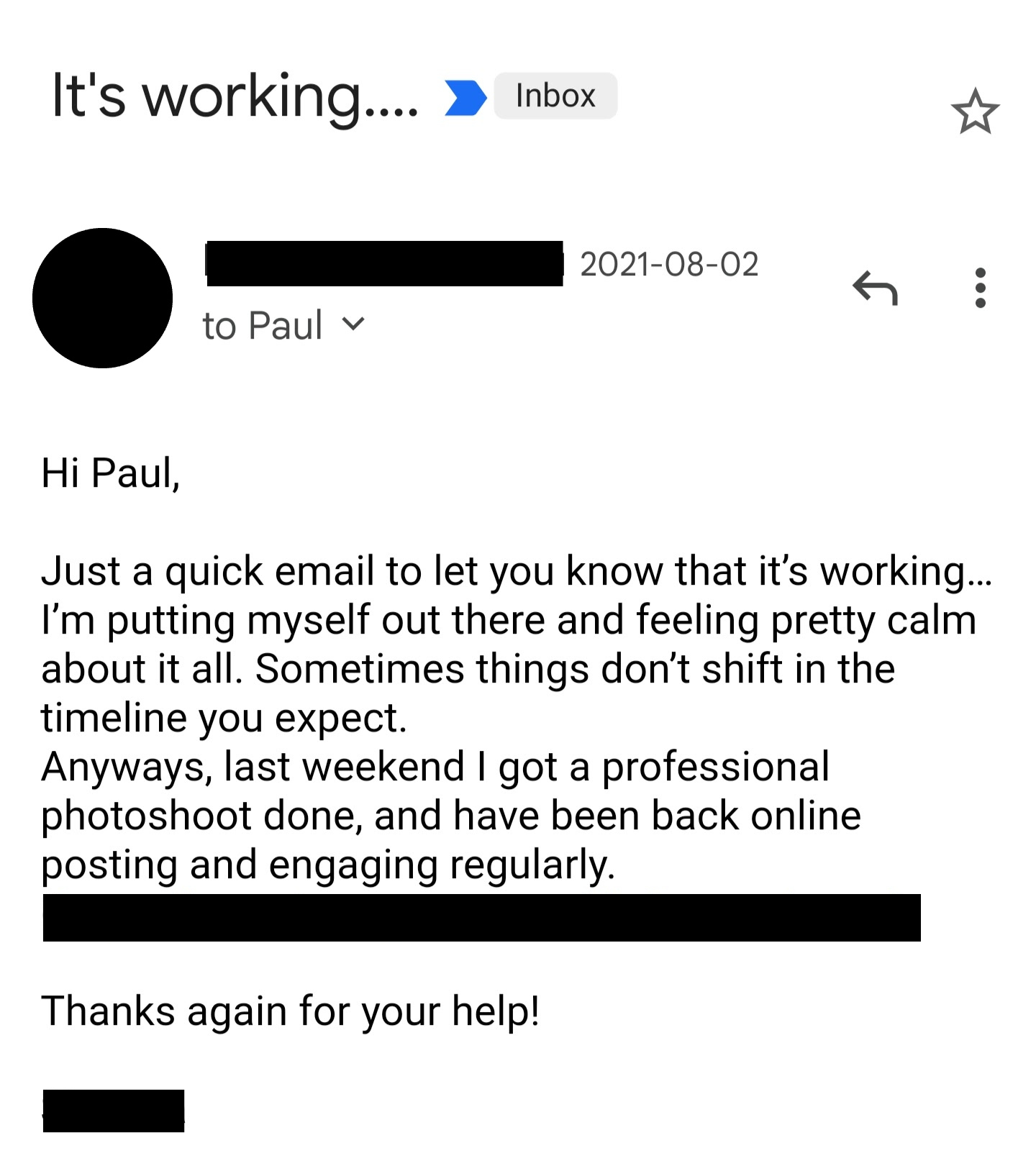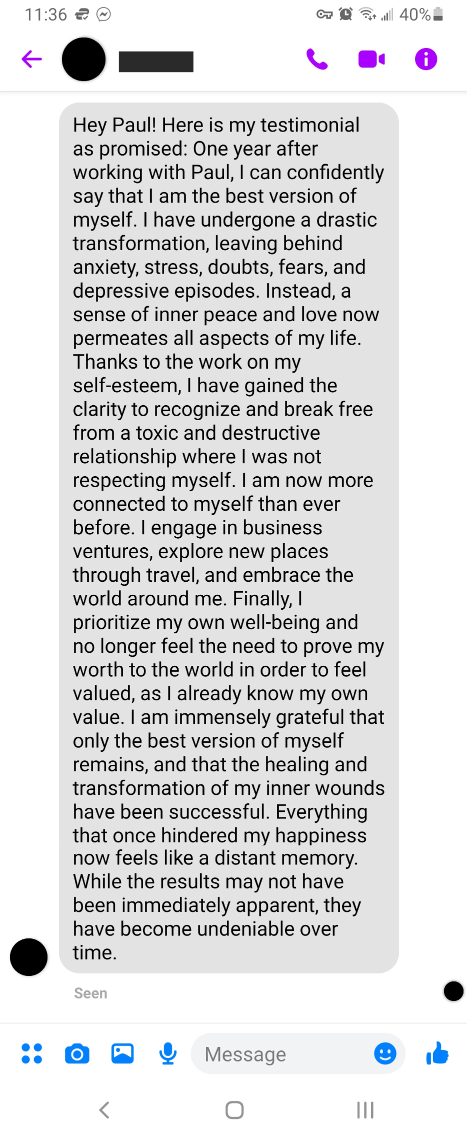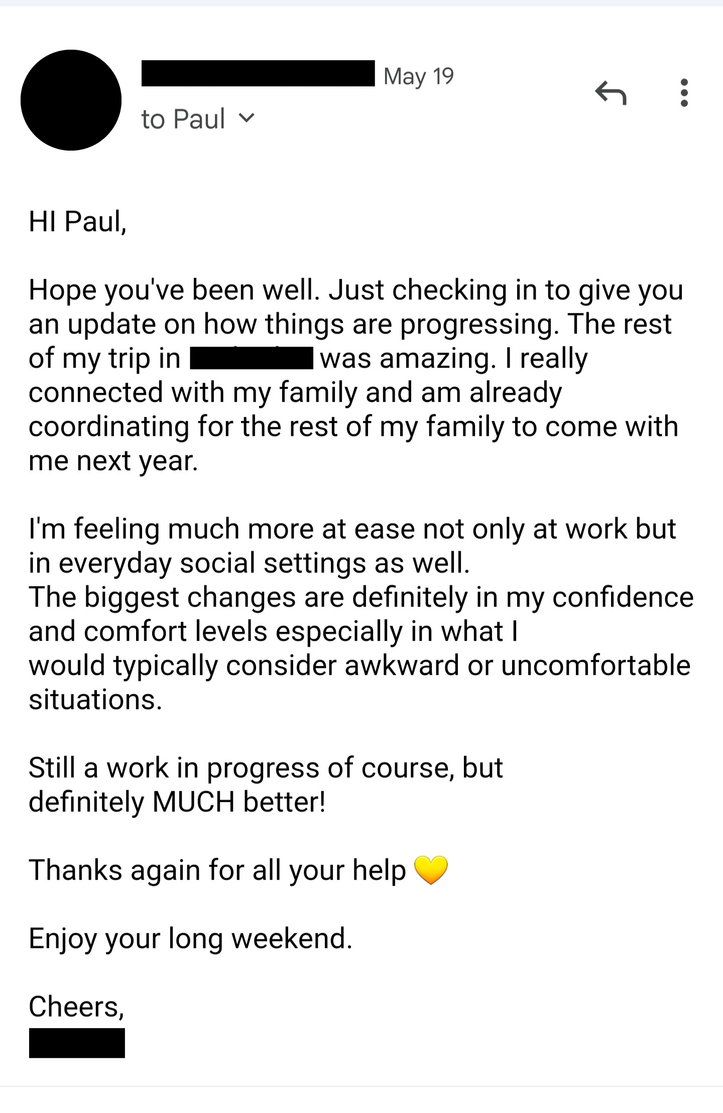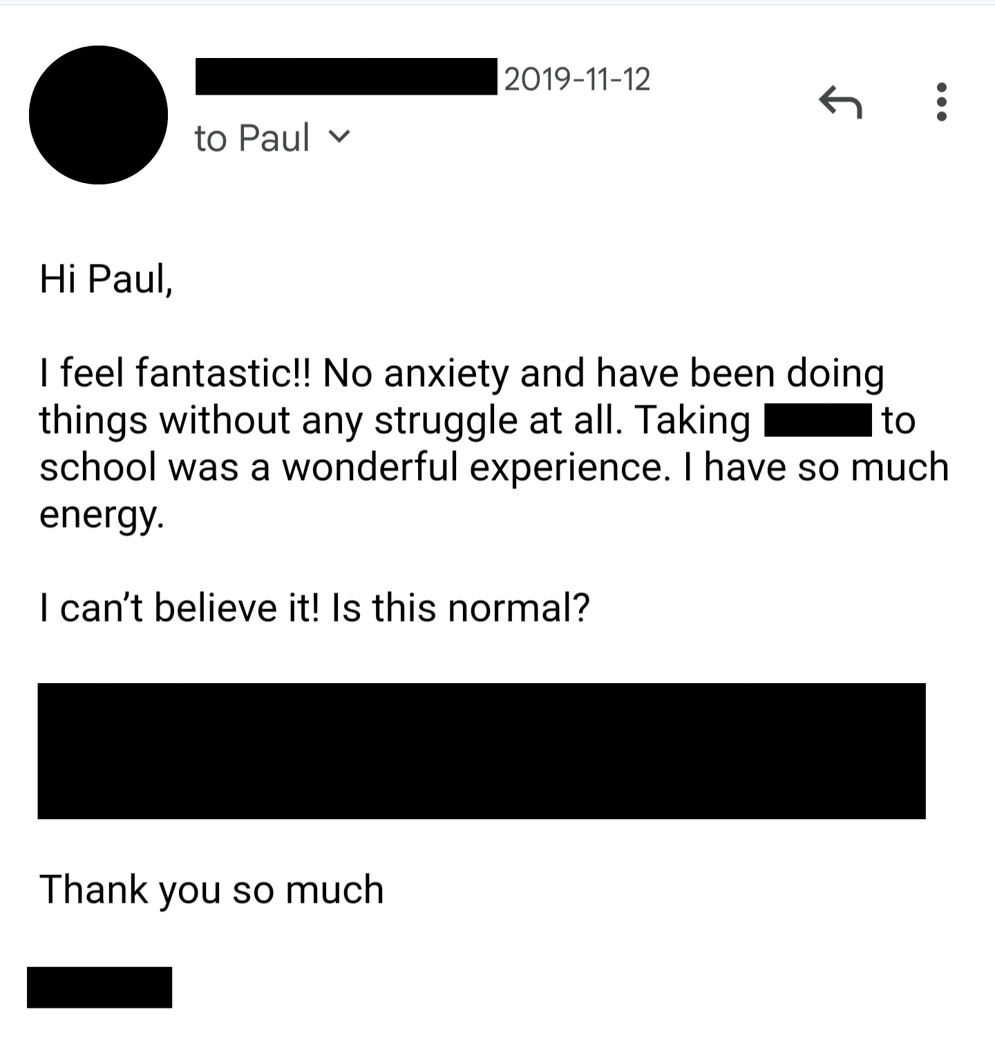 Working with Paul has been a huge success. I can’t even believe I was once so anxious, depressed, and feeling so much confusion.