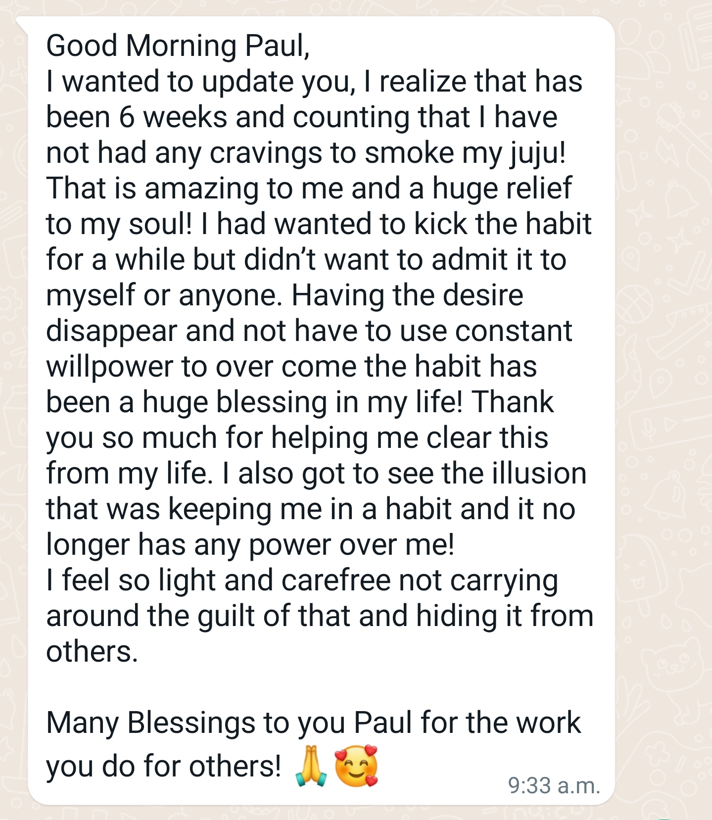 The hypnosis was successful. Since seeing Paul I rarely have urges and when I do they are easy to overcome. Paul was persistent and very positive. He also followed up after his session and really made sure that I was doing well.