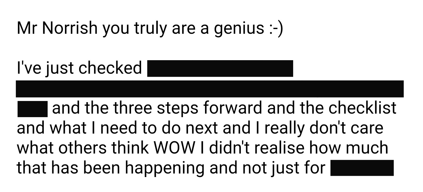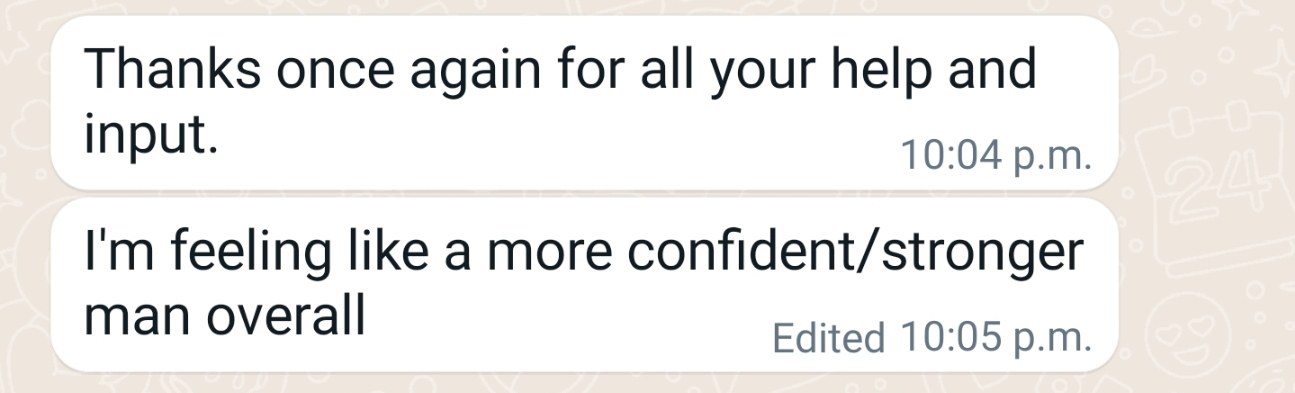 I distinctly remember while working with you that I was able to identify the fear/disapproval that I felt from my father, and that this was the very feeling that kept me behaving in the way my father wanted. I always understood that this was a relic from my childhood, but I was never able to manage it. Now, I feel like it is something I can just observe, without it hijacking my behaviour like it used to…