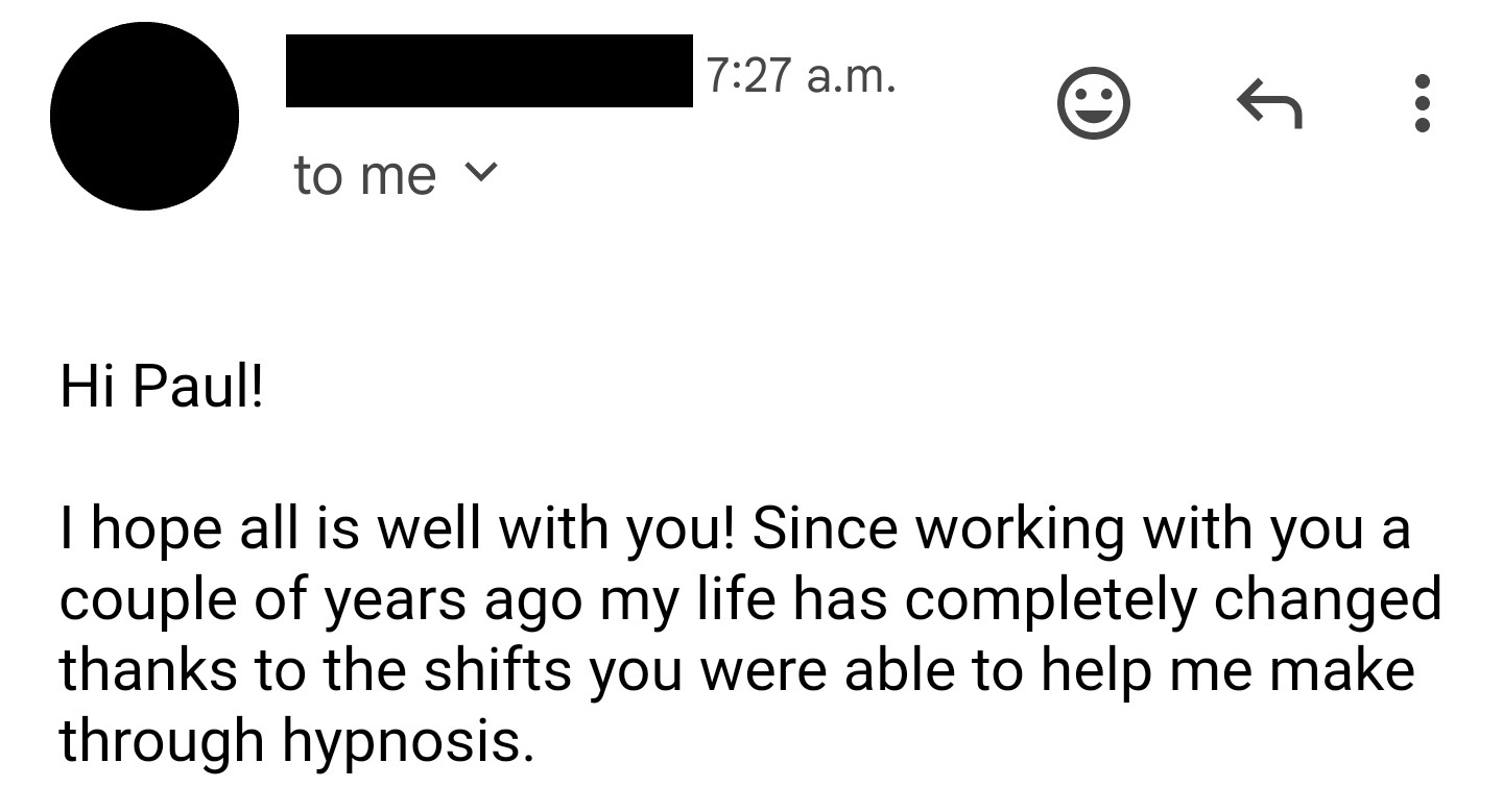 “Thanks Paul, so far everything is fantastic. Although, now I want to find more flaws to fix with hypnosis. It was a truly interesting experience…”