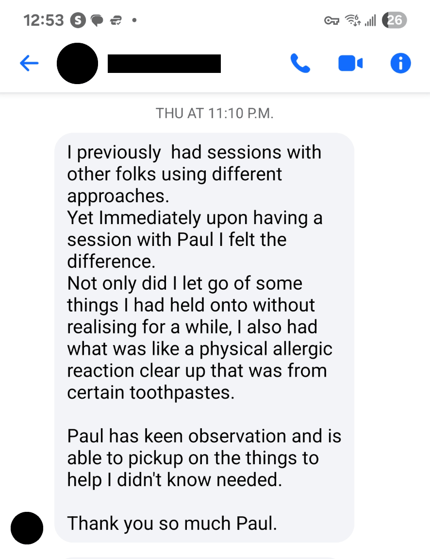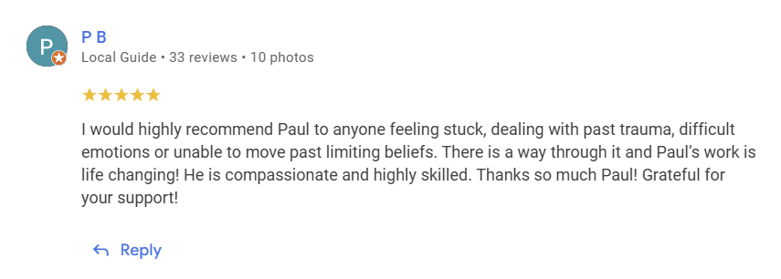 “I worked with Paul to deal with a difficult moment in my life which was the result of an accumulation of lifetime conditioning and some trauma. Anxiety and depression were issues that paralyzed me and I knew I needed help coming through to the other side. Paul was very confident and gifted in his unique approach and my sessions with him were quite revealing and even enjoyable. I believe to have had a good result with the techniques he uses and have seen a lovely improvement. I would recommend Paul to those seeking an unconventional form of help that might aid in making significant breakthroughs.”